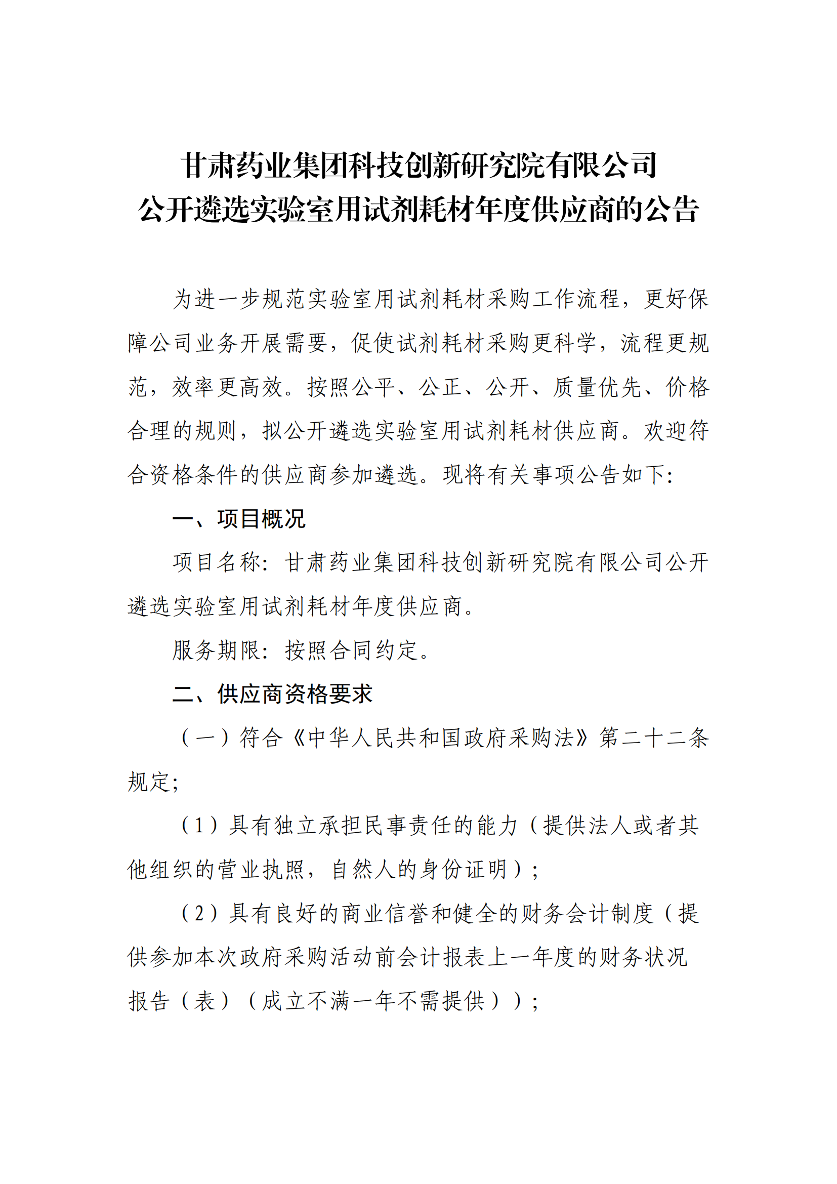 甘肃药业集团科技创新研究院有限公司 公开遴选实验室用试剂耗材年度供应商的公告