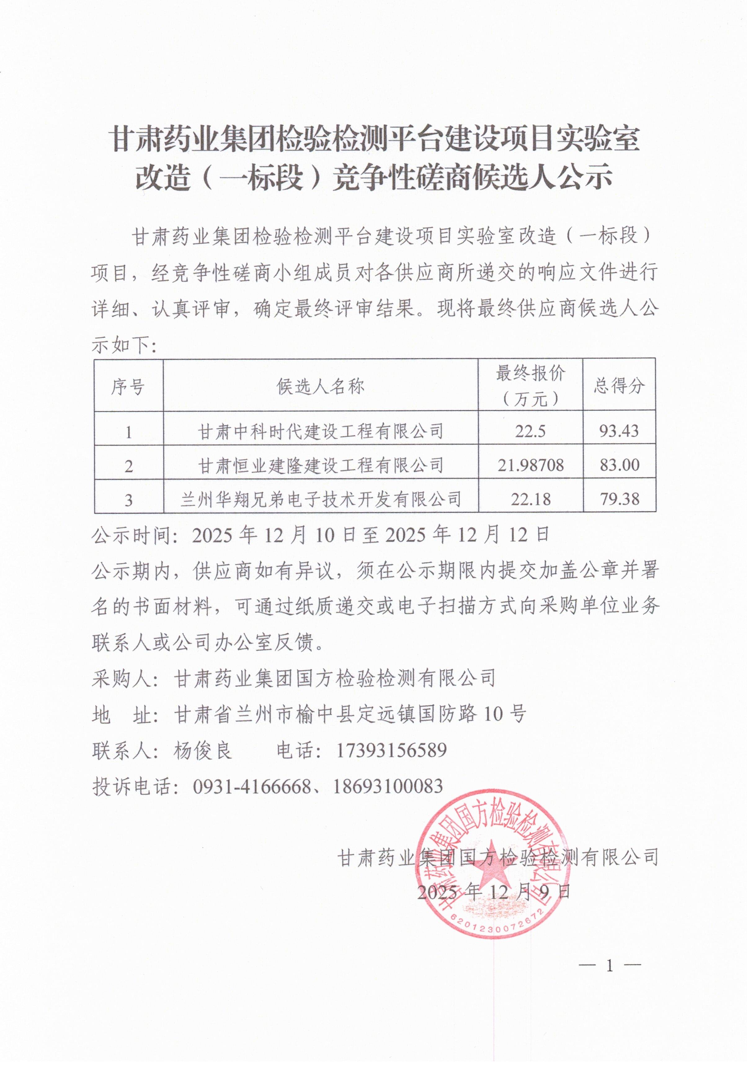 甘肃药业集团检验检测平台建设项目实验室改造(一标段)磋商中标公示